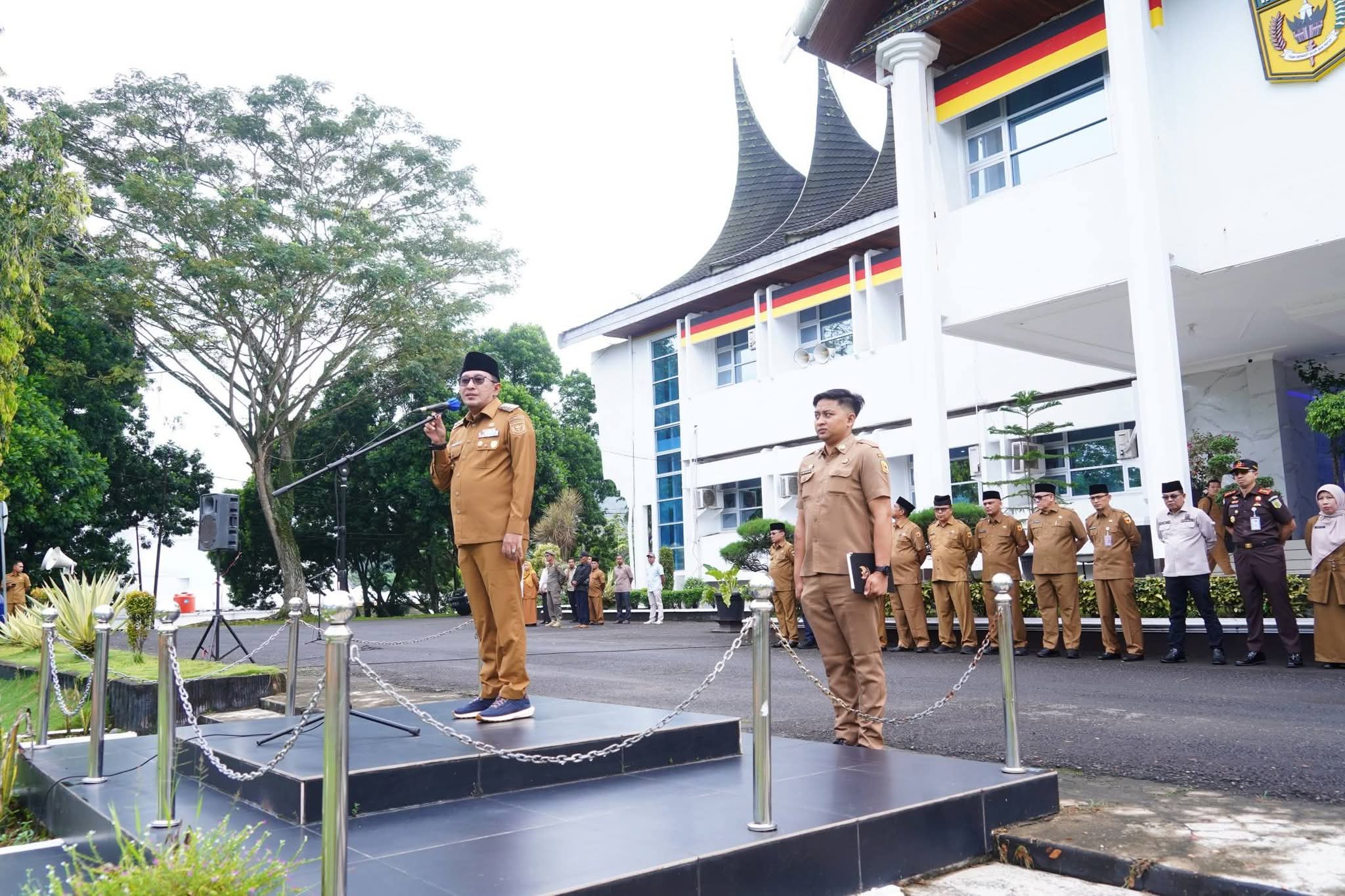 Tanah Datar – Pemerintahan Kabupaten Tanah Datar mengelar apel gabungan seluruh ASN dan non ASN sekaligus halal bihalal perdana pasca cuti hari raya Idul Fitri 1447 H yang yang dipimpin langsung oleh Bupati Eka Putra, SE, MM, Senin (30/3/2026), di halaman kantor bupati setempat