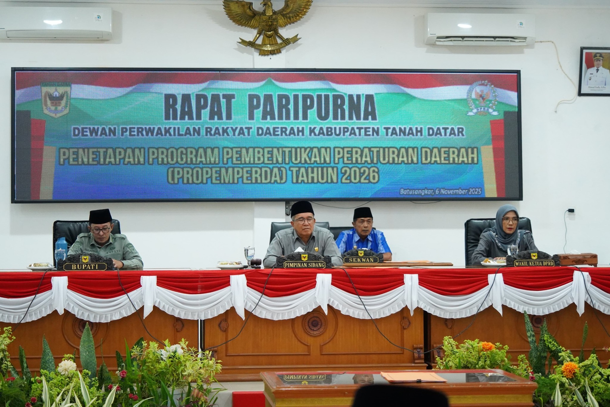 Tanah Datar, – Dewan Perwakilan Rakyat Daerah (DPRD) Kabupaten Tanah Datar menggelar Rapat Paripurna Penetapan Program Pembentukan Peraturan Daerah (Propemperda) Kabupaten Tanah Datar Tahun 2026, Kamis (6/11/2025) di ruang sidang utama DPRD setempat di Pagaruyung.