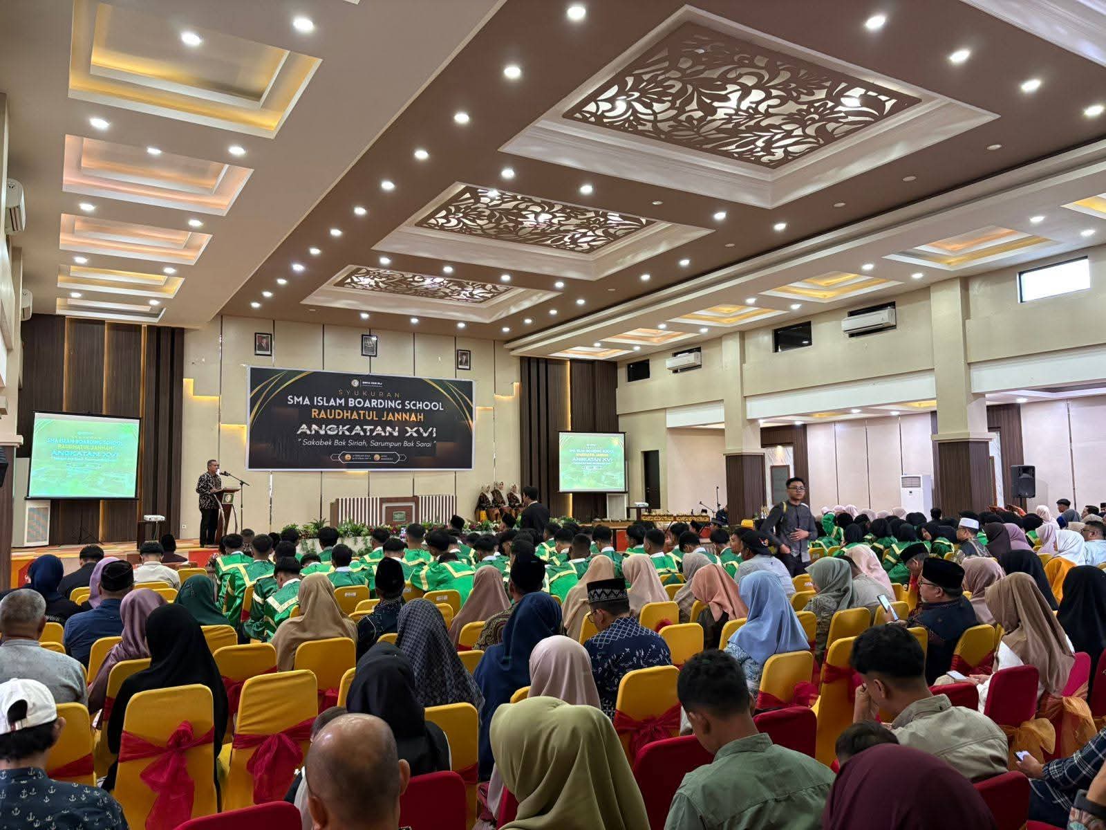 Payakumbuh — Syukuran dan pelepasan Angkatan XVI SMA Islam Boarding School Raudhatul Jannah berlangsung sukses, khidmat, dan penuh kehangatan pada Sabtu (14/2/2026) di Hotel Mangkuto, Kota Payakumbuh. Kegiatan tersebut mengusung tema “Sakabek Bak Siriah, Sarumpun Bak Sarai” yang menggambarkan semangat persatuan, kebersamaan, serta kekompakan seluruh keluarga besar sekolah.
